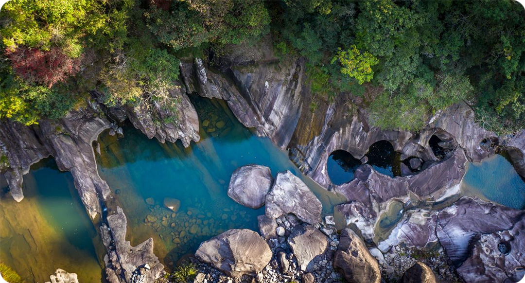 上洋村,是个不容易被人记起的小乡村,但就是因为有了冰臼群,成了去了还想去的旅游胜境。这里青山绿水,峰峦叠嶂,拥有近十公里的多样生态,造型奇特,风景秀美的冰臼群,山上怪石林立,溪谷冰臼连绵,是户外溯溪爱好者的乐园。